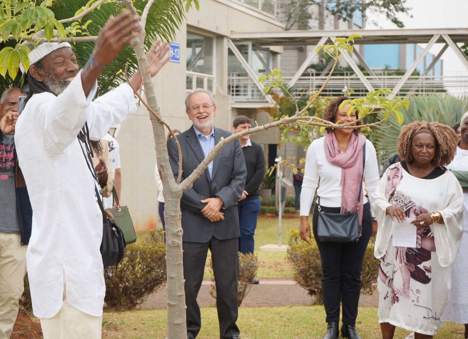 A comendadora Edna Almeida Lourenço, também participou do plantio simbólico ao lado do Reitor. O momento foi marcado ainda pela bênção e aspersão conduzidas pelo padre José Antônio Boareto. Depois, houve plantio, bênção e aspersão de uma muda de obi, presente recebido pela coordenadora do CEAAB. As duas mudas foram plantadas em frente à biblioteca, no prédio H13, próximo à muda de baobá.