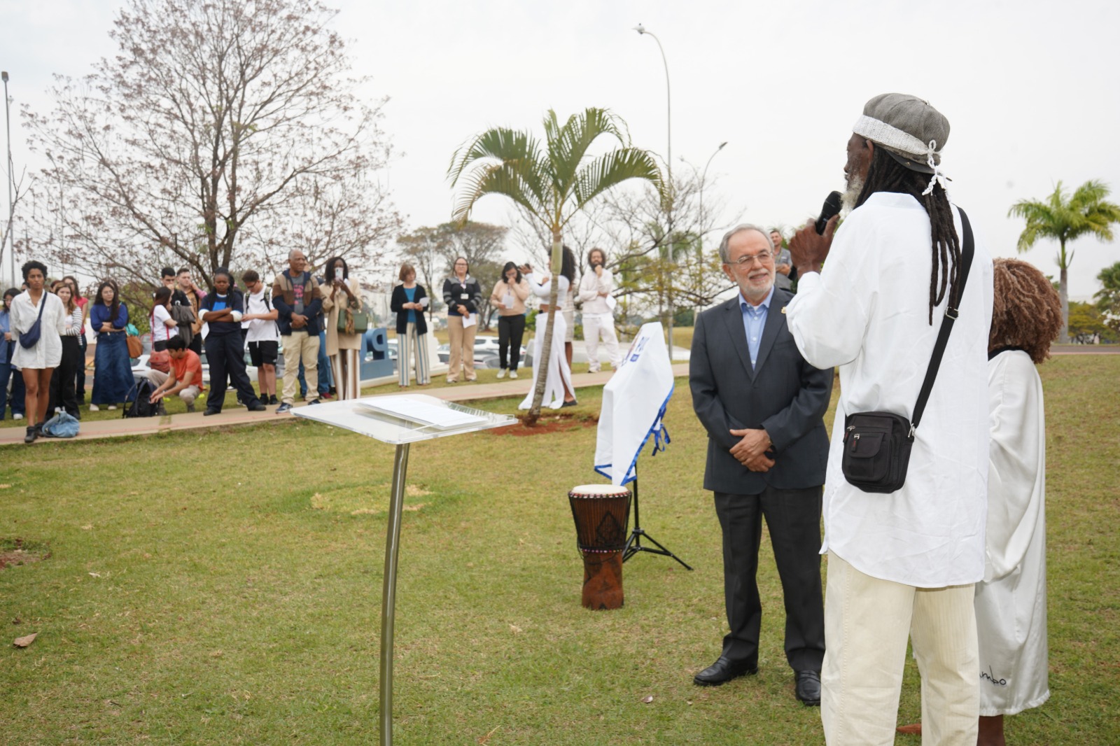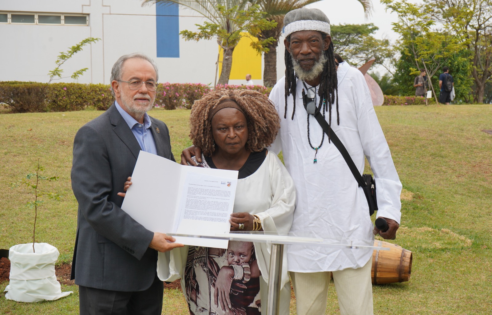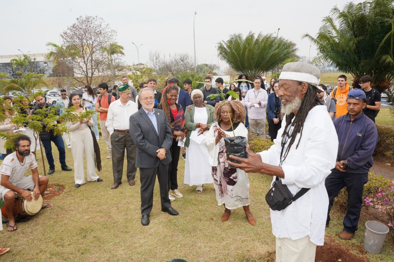O Reitor da Universidade, professor Dr. Germano Rigacci Júnior, recebeu a muda de Pau-Brasil de TC Silva como presente durante a celebração dos dois anos do Centro Afro, realizada no dia 20 de agosto, e destacou o simbolismo do ato ao compartilhar o gesto com toda a comunidade universitária.