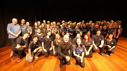 Da direita para à esquerda, a maestrina Fátima Viegas e o maestro Hipólito Ribas, regente do coral Tocando em Frente, acompanhados de diversos integrantes do grupo.