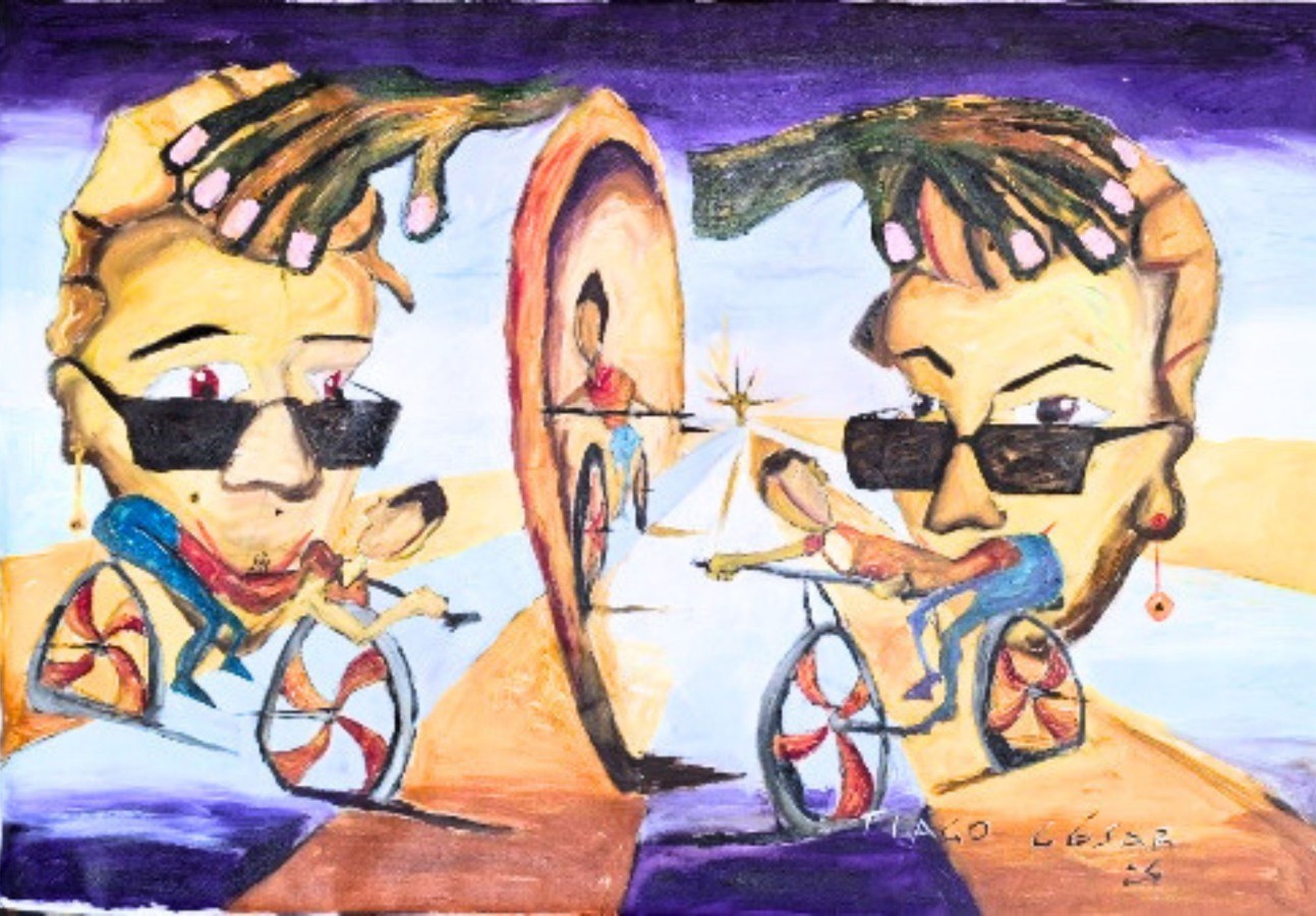 Nas telas, Tiago Cesar constrói personagens que parecem emergir de um mundo interior. São figuras fragmentadas, desconstruídas e, por vezes, enigmáticas, que expressam, em sua distorção poética, as ambiguidades e imperfeições da existência.
