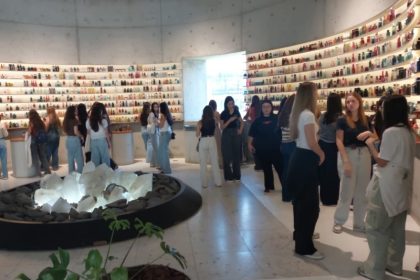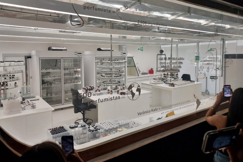 A instalação “Jardim de Frascos”, visitada pelos alunos e alunas, é composta de 1.500 frascos de fragrâncias. A obra, que busca representar o compromisso com a inovação e a sustentabilidade, foi desenvolvida pela designer Nicole Tomazi e faz referência ao cuidado ambiental da marca.