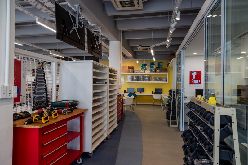 O laboratório conta com equipamentos como impressoras 3D, cortadora a laser, fresadora CNC, além de ferramentas mecânicas e eletrônicas e equipamentos operacionais, como furadeiras e lixadeiras. Durante todo o uso, os usuários têm acesso a acompanhamento técnico especializado.