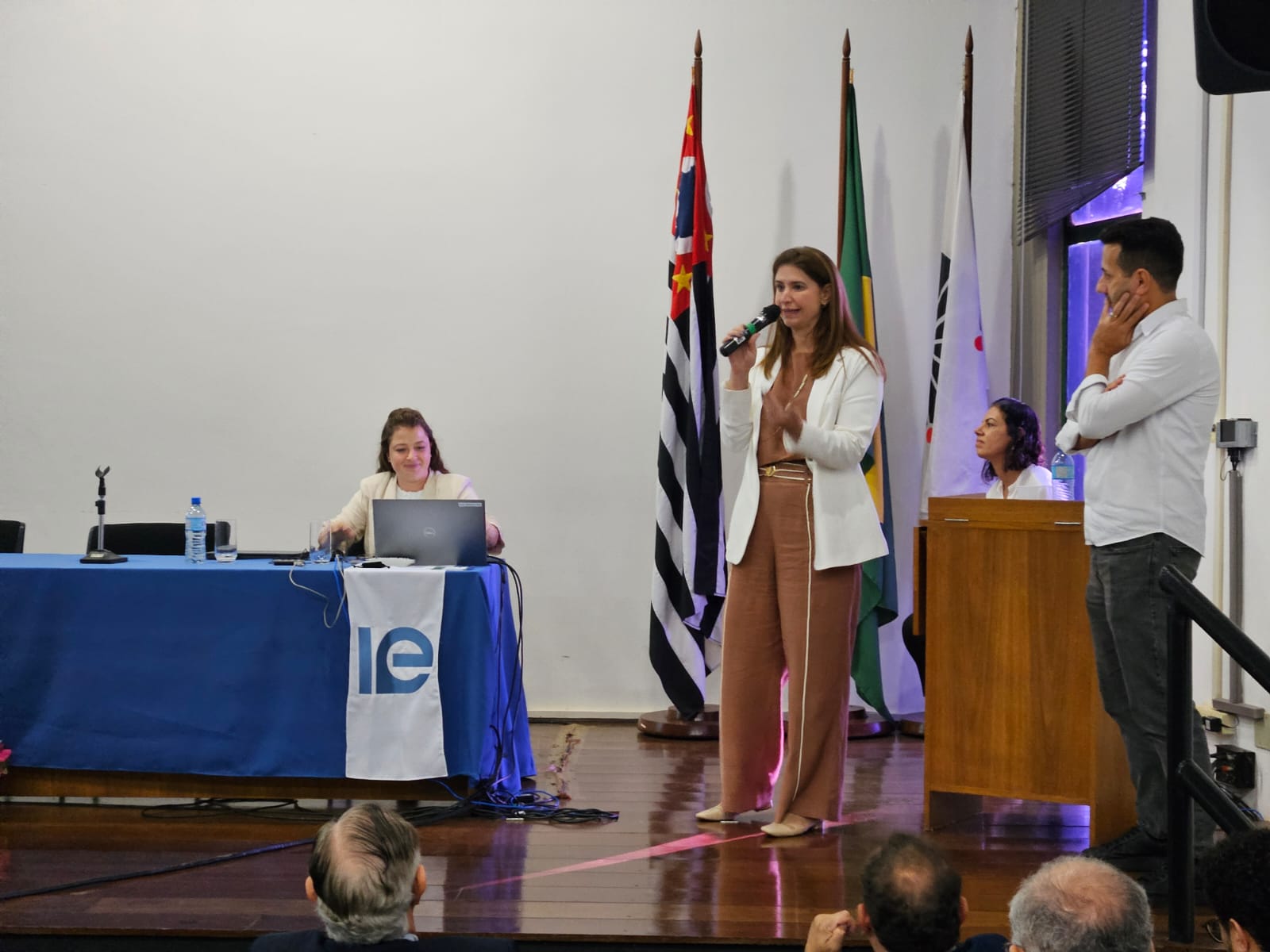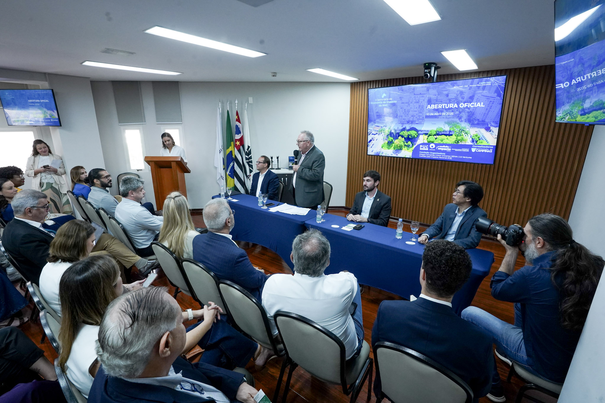 Na mesa diretiva de abertura de evento estiveram presentes o Reitor da PUC-Campinas, Prof. Dr. Victor de Barros Deantoni; o Reitor da Unicamp, o Prof. Dr. Paulo Cesar Montagner, o Decano da Escola de Economia e Negócios (EcoN) da PUC-Campinas. Prof. Me. Eduardo Frare; e o diretor do Instituto de Economia da Unicamp, Prof. Dr. Célio Hiratuka.