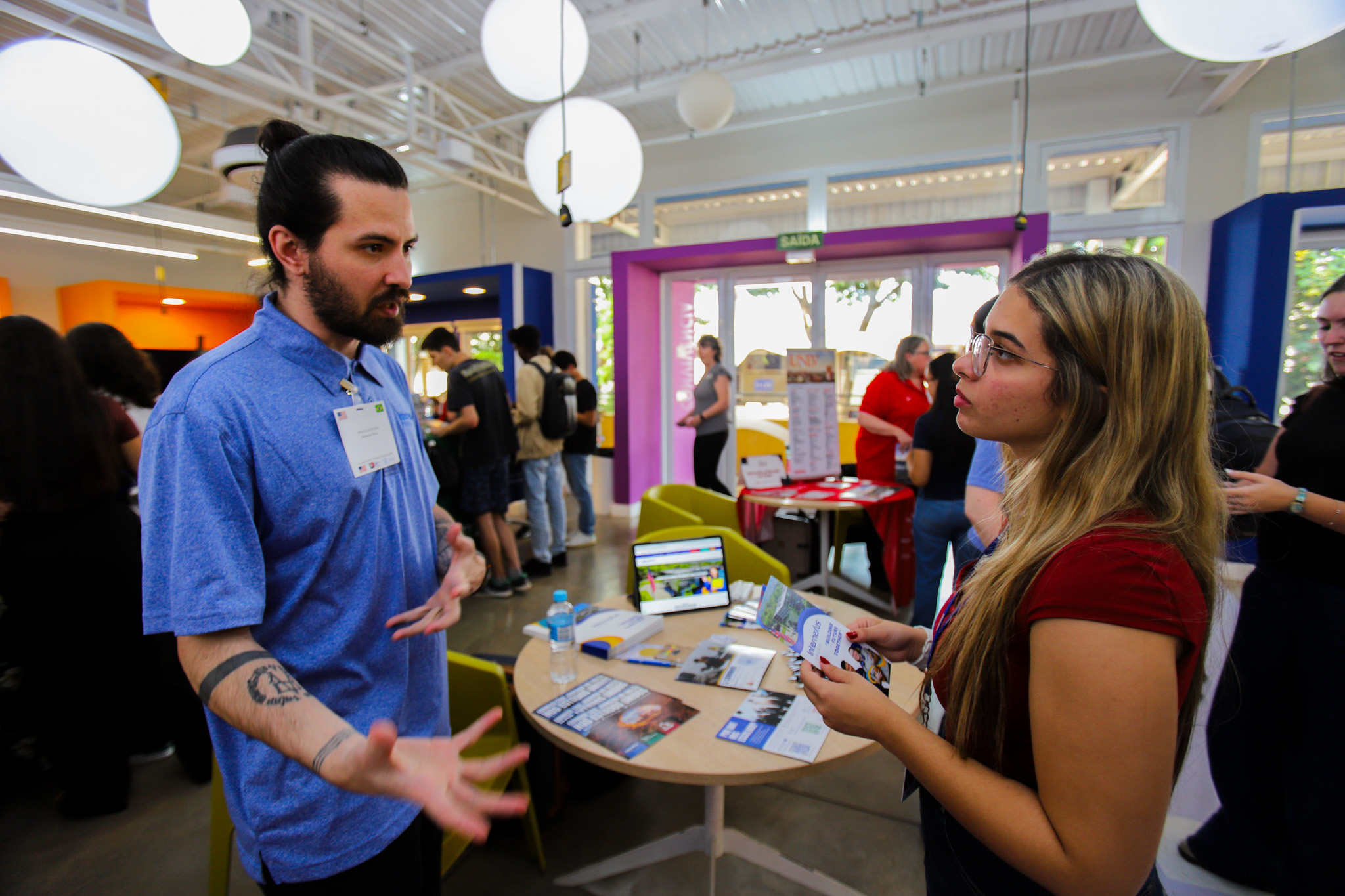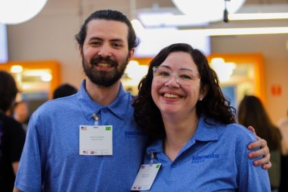 Priscila Dutra (ao lado de seu irmão, Douglas), proprietária da unidade da escola Internexus, localizada em Provo, Utah, que oferece programas intensivos para estudantes internacionais que buscam fluência em língua inglesa nos Estados Unidos, comenta que “é a primeira vez que a gente participa” da Minifeira “e tem sido muito bom, pois estamos conhecendo mais os estudantes, podendo entender o que eles precisam para viver o sonho de realizarem um intercâmbio e também como podemos melhor ajudá-los”.