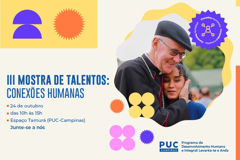 A Mostra de Talentos Humanos, realizada pelo Programa de Desenvolvimento Humano e Integral: Levanta-te e Anda, chega a sua 3ª edição no dia 24 de outubro, das 10h às 15h, no novo polo estratégico de Inovação Social da PUC-Campinas, o Espaço Tamurá, no Campus I. O tema desta edição será “Conexões Humanas”.