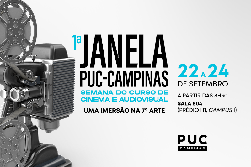 Entre os dias 22 e 24 de setembro, a PUC-Campinas sedia a 1ª Janela PUC-Campinas – Semana de Cinema e Audiovisual. O evento, que começa às 8h30 na sala 804 do Prédio H1, tem como objetivo principal aproximar os alunos do curso das dinâmicas e dos profissionais do mercado cinematográfico.