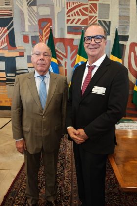 O coordenador do Departamento de Relações Externas (DRE) da PUC-Campinas, Prof. Me. Carlos Eduardo Pizzolatto (à direita), durante encontro com o ministro das Relações Exteriores, Mauro Vieira, ocorrido em meio ao evento comemorativo de sessenta anos de existência do PEC-G.