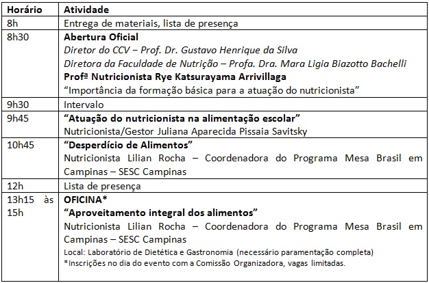 O evento, tradicionalmente organizado pelos discentes da Faculdade de Nutrição, tratará de assuntos como nutrição social, desperdício de alimentos e saúde intestinal, que serão abordados por profissionais da área nos três dias de evento, destinado aos alunos do Curso e de áreas afins, além do público externo. Oficinas práticas serão oferecidas, conforme a programação, necessitando de inscrição no dia do evento. Haverá também, durante as palestras, controle de presença para emissão dos certificados.