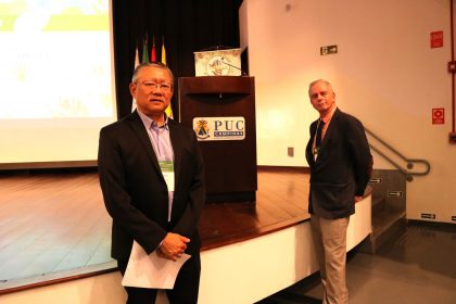 O Prof. Dr. Helton Hiroshi Hirata (à esquerda), assistente do Grupo da Mão da PUC-Campinas e diretor da Regional São Paulo da Sociedade Brasileira de Cirurgia da Mão (SBCM) e o Prof. Dr. Samuel Ribak (à direita), chefe da Residência de Cirurgia da Mão da PUC-Campinas e ex-presidente da SBCM, foram os responsáveis pelo evento realizado no Auditório Monsenhor Salim, no Campus II.