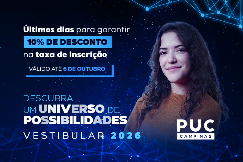 A PUC-Campinas encerra na próxima segunda-feira, 6 de outubro, o período para desconto de 10% na inscrição do Vestibular – 1º semestre de 2026. A inscrição deve ser realizada exclusivamente na página do Vestibular (www.vestibular.puc-campinas.edu.br). Após esse prazo, o estudante poderá fazer inscrição sem desconto até 20 de outubro de 2025. Os candidatos podem escolher entre mais de 70 opções de Cursos de Graduação, entre elas, as três novidades: Ciências Sociais com Ênfase em Inteligência Artificial, Design de Produto e Inovação e Inteligência Artificial.